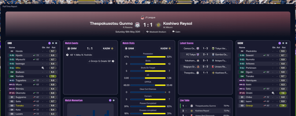 The 2040/41 campaign began with a few players exhausted after an Olympics call-up, and a weakened side struggled to a 1-0 defeat at JEF United. Rasamu rested the squad, which paid off as Shimizu and Badwan earned a 2-1 win at home to Cerezo Osaka, before a wild 3-3 at Shimizu and Okamoto’s brace led a 3-0 win over Yokohama. A fairly up-and-down start continued, including a 2-1 defeat at Kashiwa, which left Gunma 8 points off the top in mid-November. However, Kato, who’d started the season slowly, hit top form with two goals in a 4-1 win over JEF United before going one better with a hat trick in a 4-1 victory at Vissel Kobe.