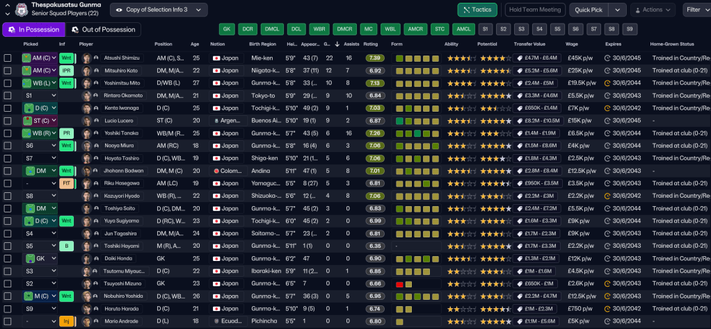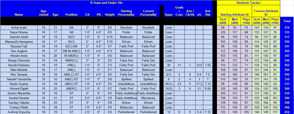The Gunma squad is now more or less fully homegrown, with a huge number of players having come through the youth academy. Lucero is by far the best player in the save so far with a score of 454 in Rasamu’s attribute ID, followed by Badwan (419), Kato (417), Mito (410) and the rapidly improving Saito (407).