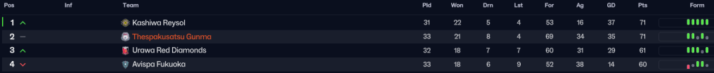 The good form continued to send Gunma into what was realistically a two-horse title race. However, Kashiwa were very much in control with 2 games in hand.
