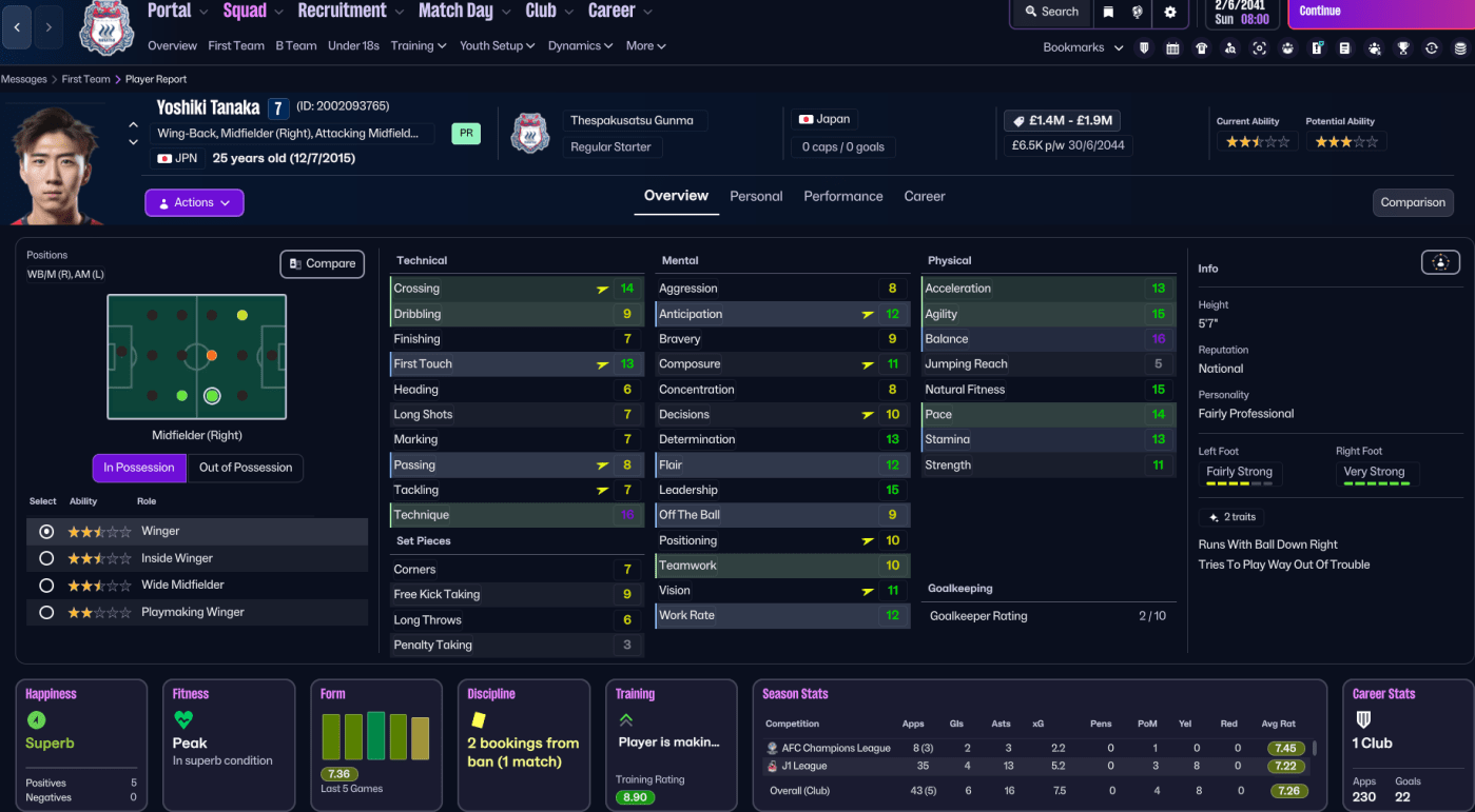 Finances were boosted by midfielder Víctor Gómez, who contributed 0 goals or assists in 26 games, attracting surprise bids from Porto and Man United, who he joined for £6.5m. Centre back Yuji Nagashima also departed after 263 games for the club to Saudi for £3.5m, along with backup attacker Oli Magnusson to ReinMeer for £1.1m and left back Michiteru Masushima to Sendai for £300k. That boosted the bank balance to £48m, while Rasamu had a transfer kitty of £47m that he couldn’t really dream of spending. Instead, he dished out a few new contracts, including wingback Yoshimitsu Mito pocketing a club record £19,500 per week that was swiftly surpassed by Japan international midfielder Atsushi Shimizu bagging £45k a week once he’d ended his unhappiness at the club.