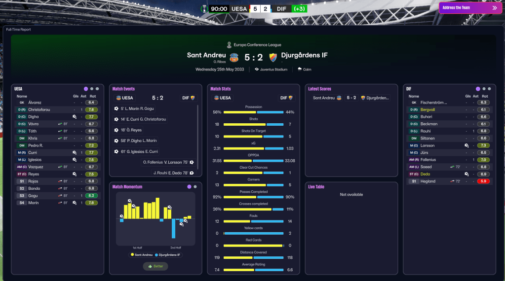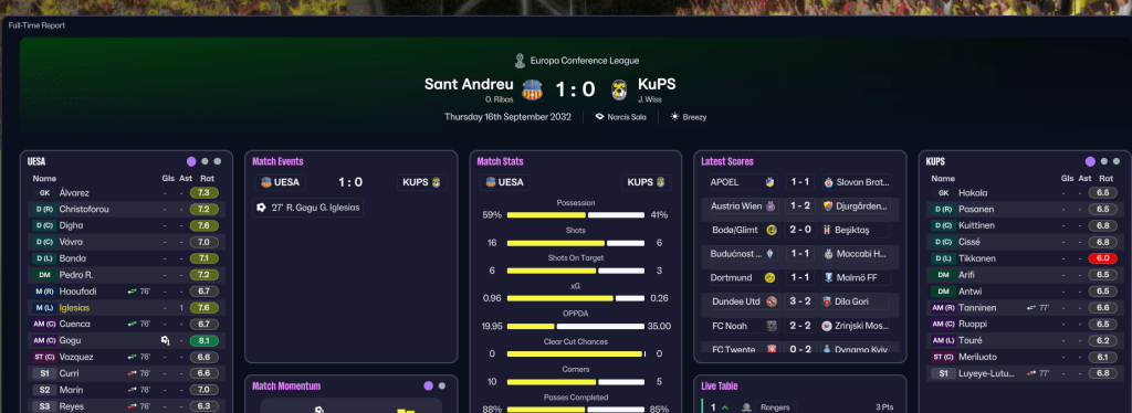 Ribas certainly could not have imagined he’d be leading his beloved Sant Andreu into European action just 7 years on from taking charge. But that was the case as they boarded a flight to Hungary to face Puskás Akadémia in the Europa Conference League qualifiers. Curri, Iglesias and Reyes earned a comfortable 3-1 win, allowing Ribas to rotate and edge a 3-2 home win, which set a new gate receipts record of £450k.