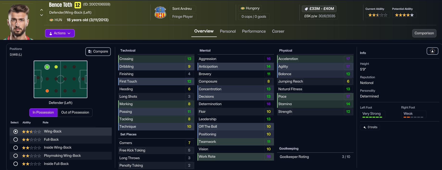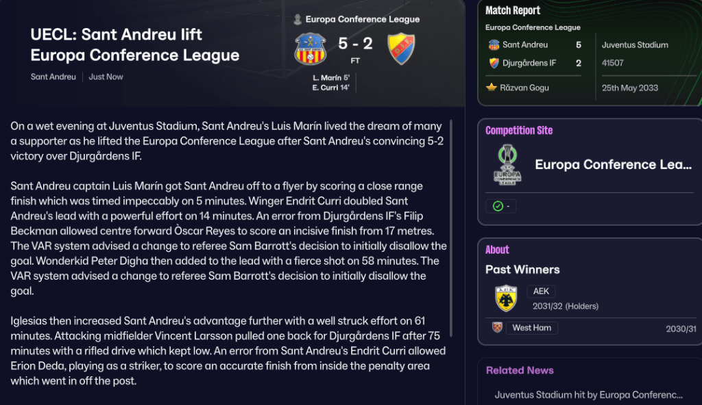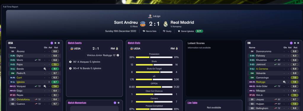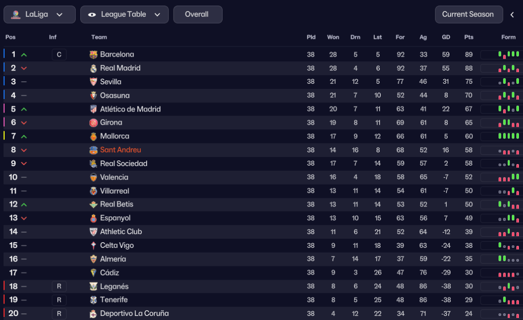 That uptick in form moved Sant Andreu into the top half of LaLiga, and they sat 9th on 28 points halfway through the season. They started 2033 slowly, but exploded into life as Reyes bagged a brilliant new club record four-goal haul in a 7-1 demolition of struggling Villarreal. That win aside, Sant Andreu went a bit draw-happy, drawing five out of seven through February and March, including a 0-0 at home to Atlético. They had Vazquez to thank for two easy wins, as he scored a hat trick against Leganés and a brace to defeat Phil Neville’s Cádiz.