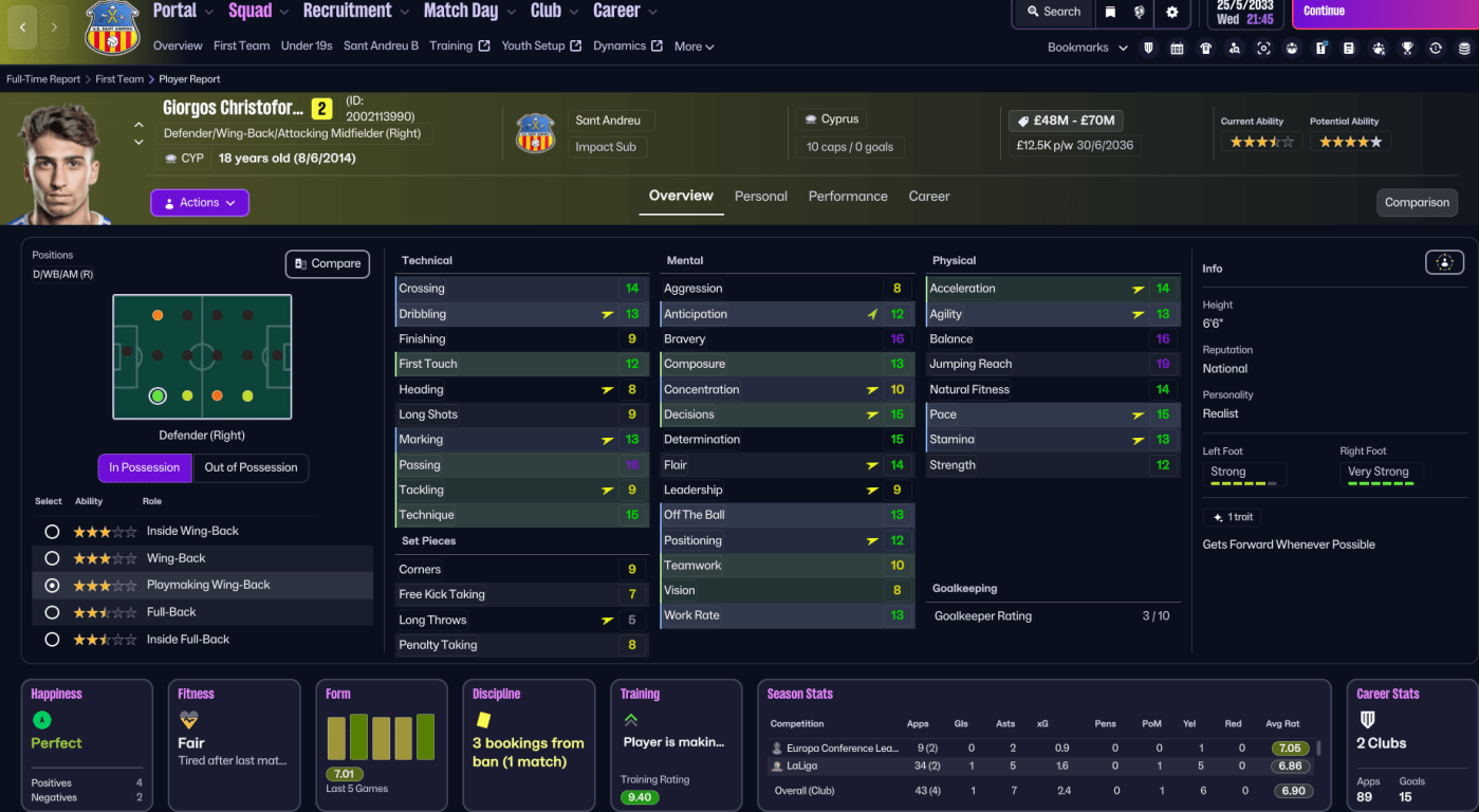 That uptick in form moved Sant Andreu into the top half of LaLiga, and they sat 9th on 28 points halfway through the season. They started 2033 slowly, but exploded into life as Reyes bagged a brilliant new club record four-goal haul in a 7-1 demolition of struggling Villarreal. That win aside, Sant Andreu went a bit draw-happy, drawing five out of seven through February and March, including a 0-0 at home to Atlético. They had Vazquez to thank for two easy wins, as he scored a hat trick against Leganés and a brace to defeat Phil Neville’s Cádiz.