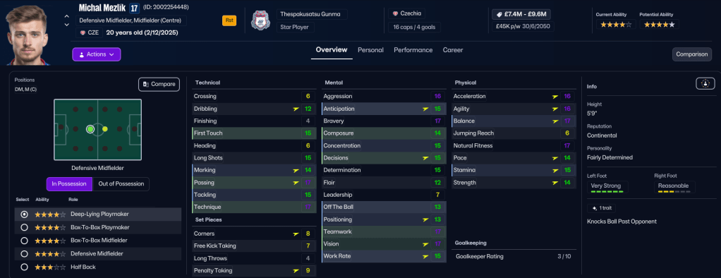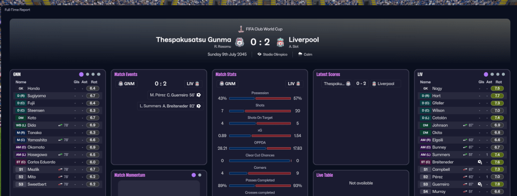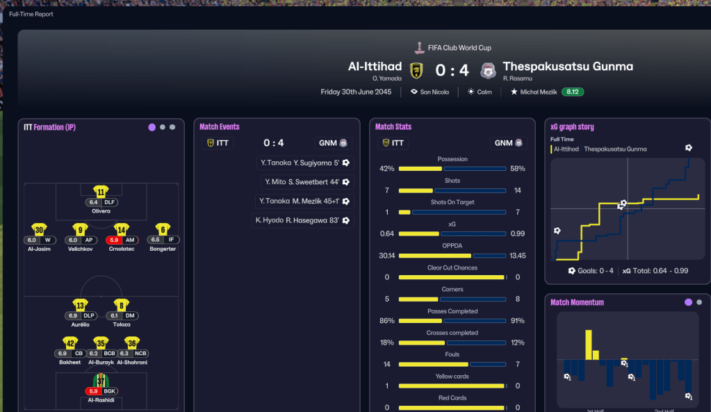 Liverpool bossed the early stages, having 5 shots but none on target. But it was Gunma who had the first chance, as Okamoto slid Sweetbert through, only for the keeper to make a great save. And they went into halftime at 0-0. But Liverpool went ahead thanks to some shambolic defending (courtesy of the shocking FM26 match engine, see below left), which forced Rasamu to go for it and Liverpool began to twist the knife, going on to deservedly win 2-0. Mezlík was named the Best Young Player at the tournament, with Sugiyama and club legend Yoshimitsu Mito making the Dream team.
