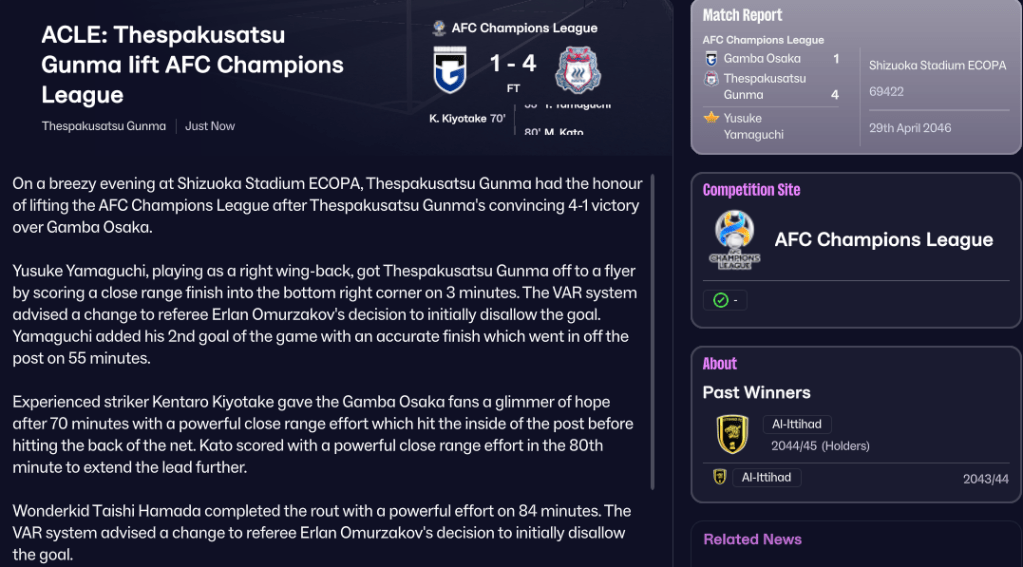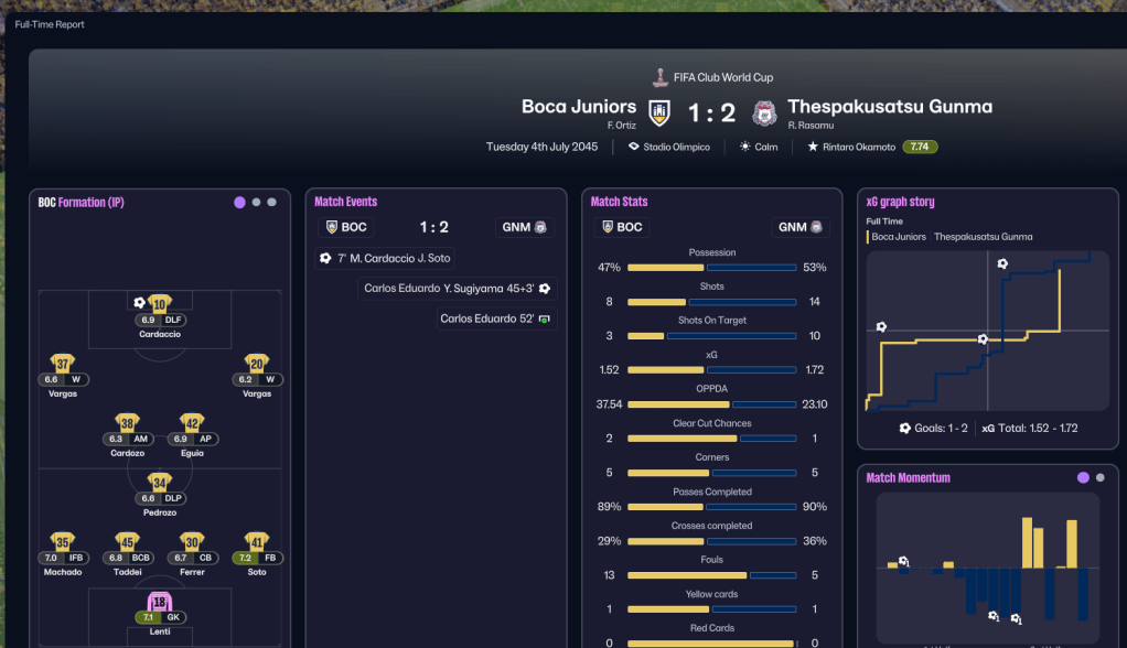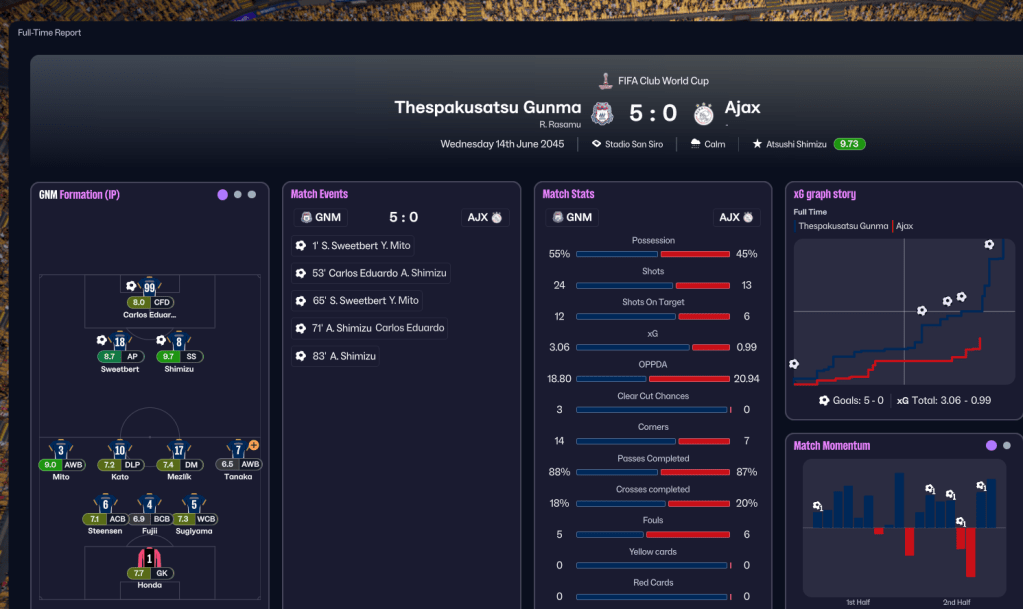 The summer of 2045 was cut short as Gunma’s continental performances took them to the Club World Cup for the first time. Rasamu gave the team two weeks off before flying out to Milan, Italy, to prepare for a group alongside Ajax, Colo-Colo and Mamelodi Sundowns. Gunma kicked off against Ajax, and the time off seemed to have worked wonders as they cruised to a stunning 4-0 victory, led by the soon-departing Shimizu’s late brace after his replacement in waiting Shadrack Sweetbert had also scored twice. Four days later, they faced Colo-Colo and an unlikely brace of headers by centre back Masayuki Hasegawa, which doubled his career tally, secured a comfortable 3-1 victory. The group wrapped up against the South African side, and a rotated side won 2-1.