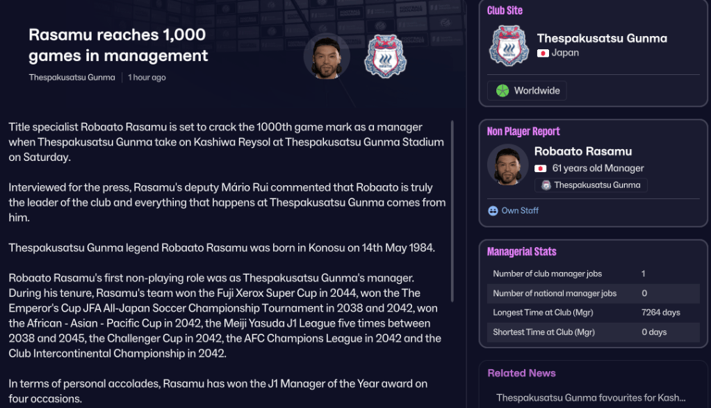 Rasamu departs Gunma after 21 years, 7,468 days and 1,038 matches. Of those, he won 599, drew 205 and lost 234, scoring 1,932 goals and conceding 1,123, with a win ratio of 57%. He won six league titles and 10 cup competitions, including two Asian Champions Leagues. Rasamu signed 101 players for a total outlay of £69.95m but sold 123 for an intake of £198m. Lucio Lucero was his record purchase for £9.5m, with Miura the record sale of £30m.