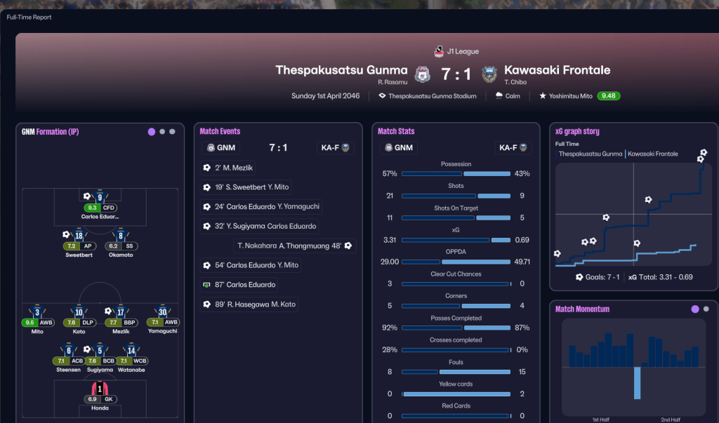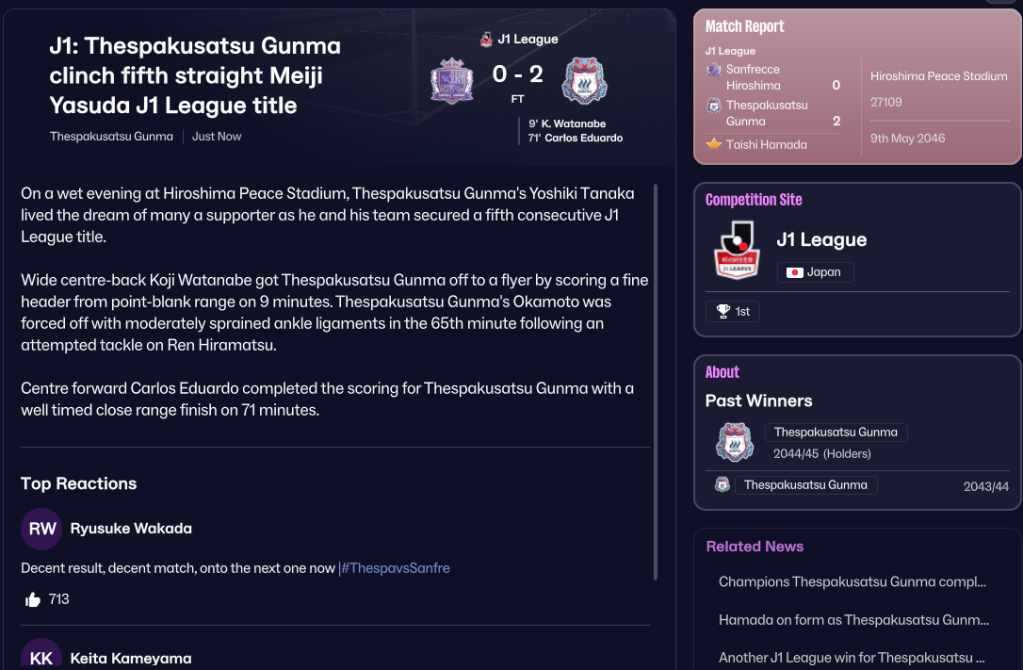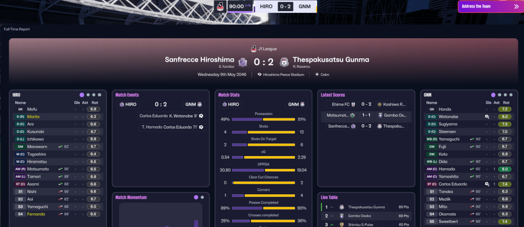 Gunma eventually lost 3-0 at Gamba, but bounced back in style to thrash Kyoto 5-1 and head into the new year with a 10-point lead. They also went into 2046 as cup winners, as Eduardo and an own goal saw Gunma defeat Shimizu 2-1 to lift their third Emperor’s Cup before the two teams locked horns again, and Eduardo and Hamada secured a 2-0 victory to claim their second Fuji Xerox Super Cup. The new year began just as the old one had ended, with the reliable Yoshiki Tanaka inspiring a 4-0 thrashing of Kofu. And they continued to dominate domestically, including an Eduardo hat trick leading a 7-1 demolition of Kawasaki.