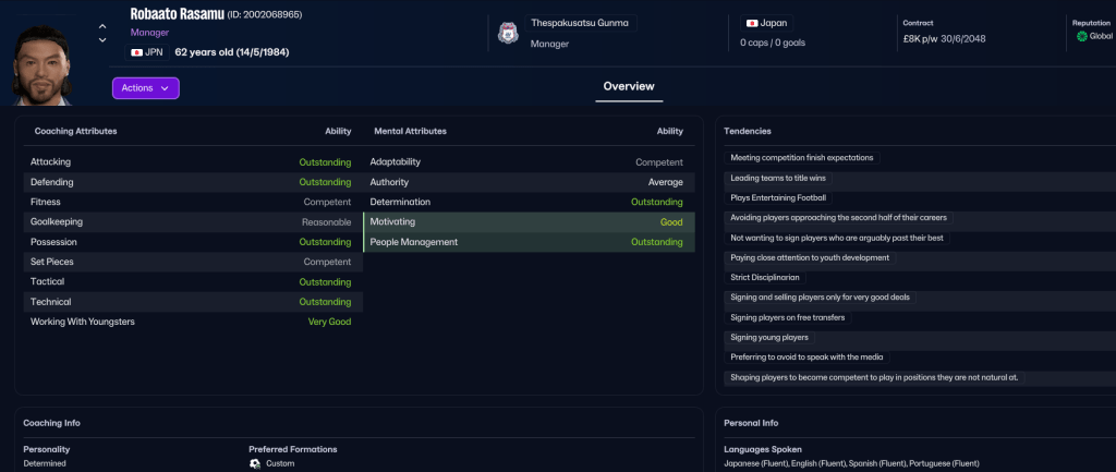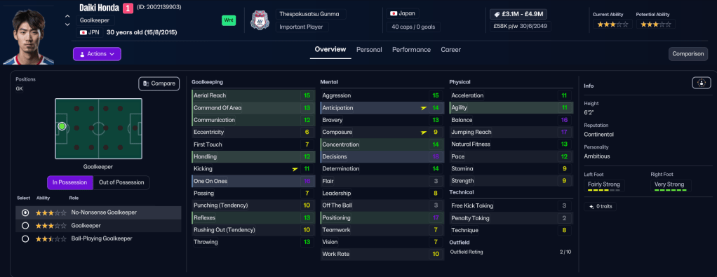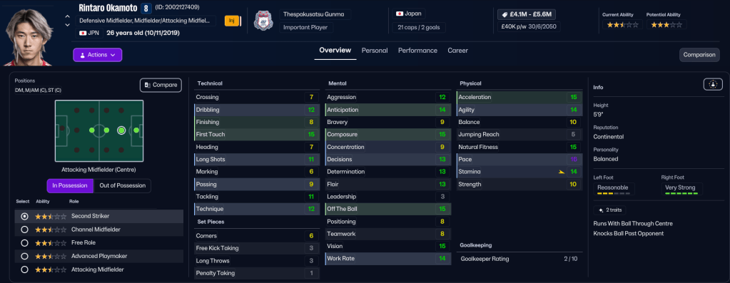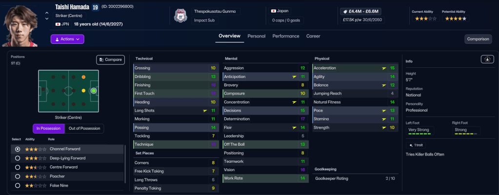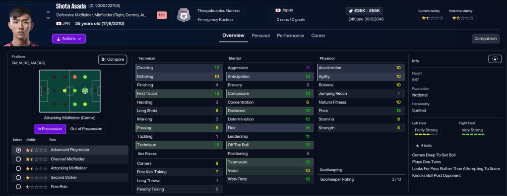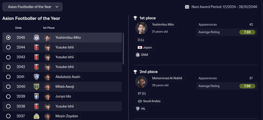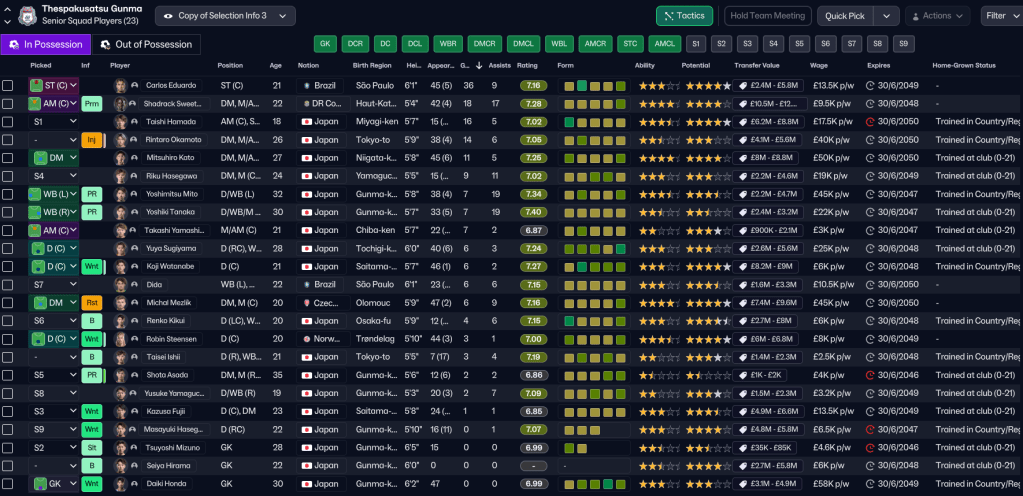 However, a fifth successive title and a second Champions League success feels like a good time to bring this Wonderkid Factory story to a conclusion. It’s probably the best one we’ve ever had, developing some homegrown superstars in the likes of Mito, Kato, Watanabe, Sugiyama and Okamoto and the departed Shimizu and Miura. In a way, it felt sad to leave with the likes of Eduardo and Hamada developing superbly and set to become superstars. But, after 21 years, Rasamu felt he’d achieved all he could at Gunma. However, you can see just how good some of these players have become, in order of ability, in the screenshots below (and Mito at the top).