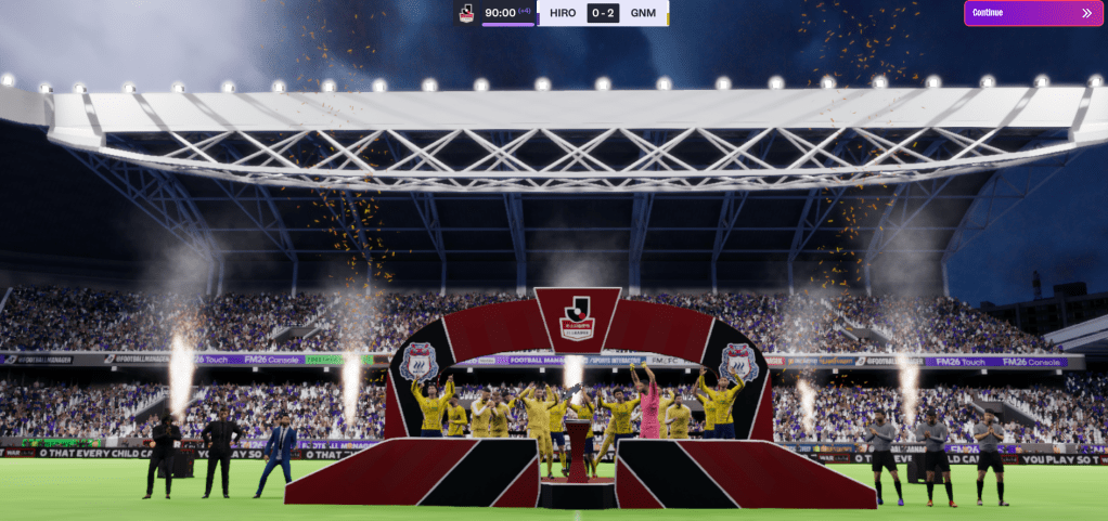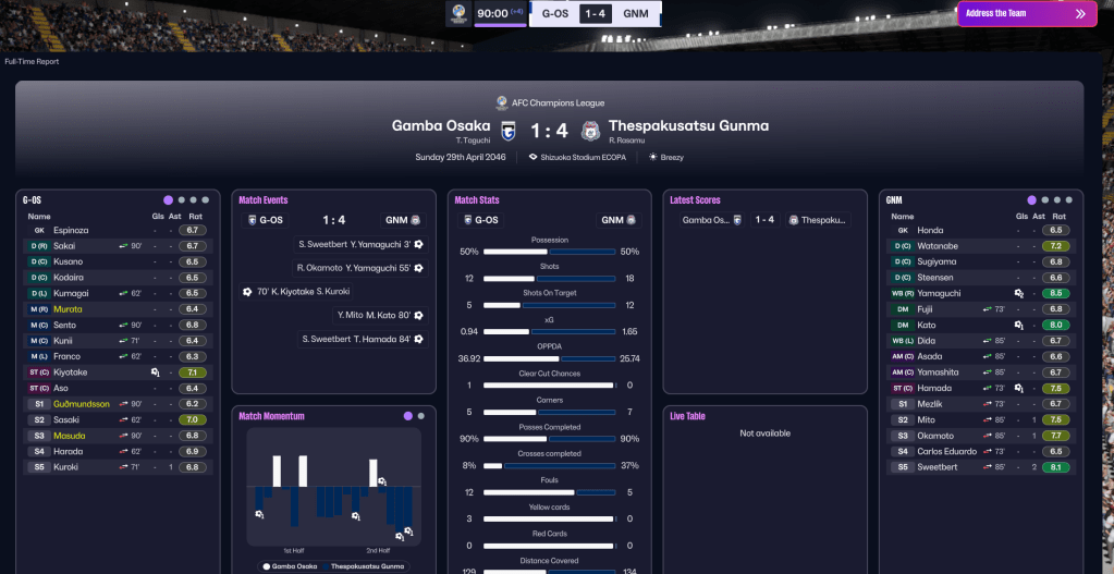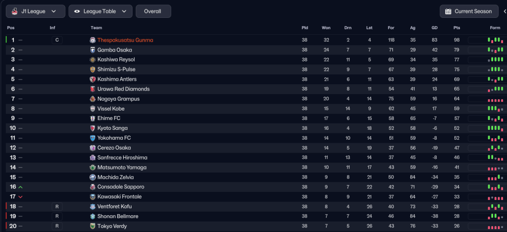 Eduardo broke his own club record league goals tally in a 2-0 win at Nagoya. And Gunma destroyed their competitors, winning the league by 19 points with a new record tally of 98 after 32 wins, 2 draws and 4 defeats. They also smashed the record goals tally, scoring 20 more than Gamba’s record of 98, scoring an incredible 118 and conceding 35. Mito was the best player in the league with a 7.55 average rating, ahead of Tanaka’s 7.46. Eduardo was again the top scorer with 31 in 37, with Sweebert 6th with 16 in 35, and Mito led the assists with 17, ahead of Tanaka (16) and Sweetbert (13). Tanaka and Mito also led the key passes (101 and 94) and chances created (32 and 27) charts, while Kato (3,097) attempted the most passes ahead of Mezlík (2,988). Mito became the first Gunma player to win the league’s MVP award and Rasamu bagged his fifth manager of the year award.