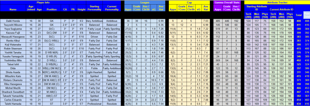 Mezlík (466) and Sweetbert (447) have developed into two of the best players Gunma have ever had, according to Rasamu’s attribute ID system (only behind Lucero’s 475). And they now have eight players scoring over 400. The amazing Mito has played a club record 569 games in all competitions, while he and Tanaka have both got 160 assists and more than 50 goals each. Okamoto leads the way on 97 goals in 388 games, but Eduardo has scored an impressive 81 in 96 games.
