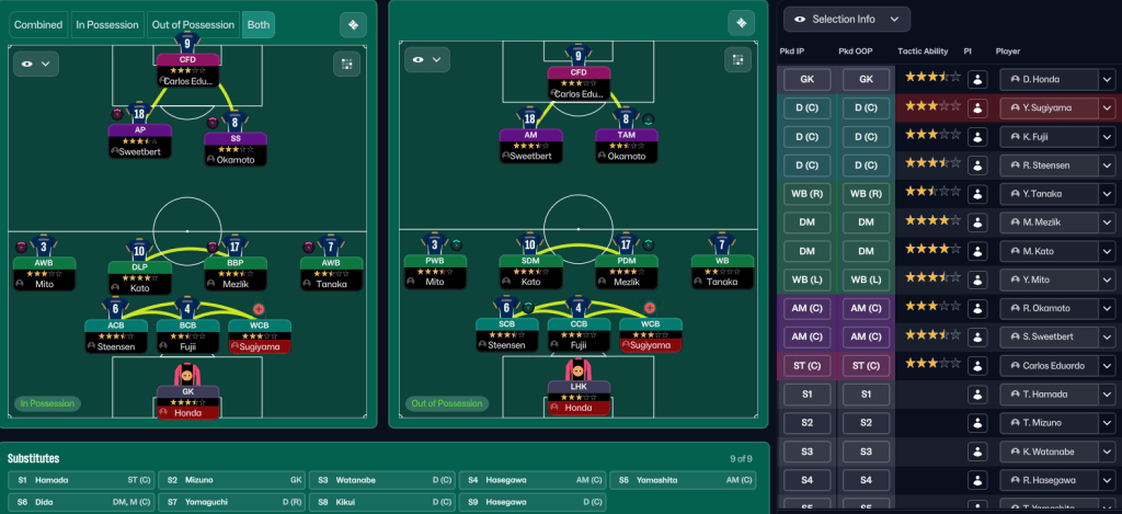 The 3-4-4 approach worked wonders again, led by advanced wingbacks Mito and Tanaka equally sharing 14 goals and 38 assists, the latter followed by Sweetbert (17), R Hasegawa (11) and Mezlík and Eduardo (9). While the impressive Eduardo again led the way with 36 goals in 50 games, followed by the brilliant Sweetbert (18), Hamada (16), Okamoto (14), Kato (11), R Hasegawa (9) and Mito and Tanaka (7).