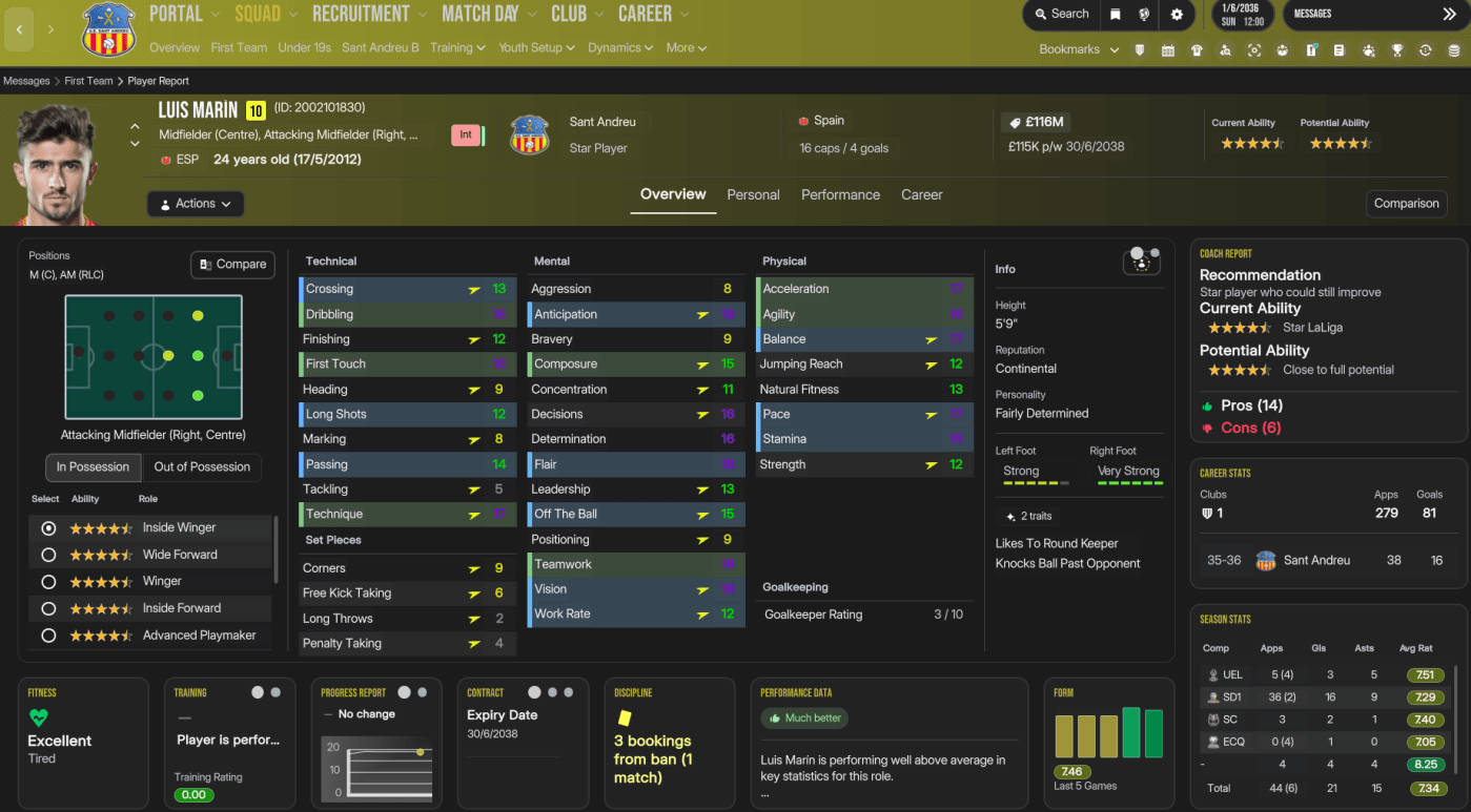 The future at Sant Andreu was very bright, as Folleco and Pihl came 3rd and 4th on NxGn 2036, with Norbert 8th, left back Kelechi Suleiman 31st and Nilsen 44th. They also had another stellar youth intake with 4 elite prospects and 2 top players, led by 5-star potential attackers Aran and Carlos Morer and midfielder Dimitrije Radojicic. That takes the club to 23 players with 5-star potential, 13 of which are in the under 19s, as well as six more with 4.5-star potential. The best of the lot, potentially, is winger Souleymane Kouadio, along with Folleco, Cunha, Espinola, Morar, Grima, Henrique Mira, Aran, and last year’s intake stars Pablo Guerrero and Aran Herrera.