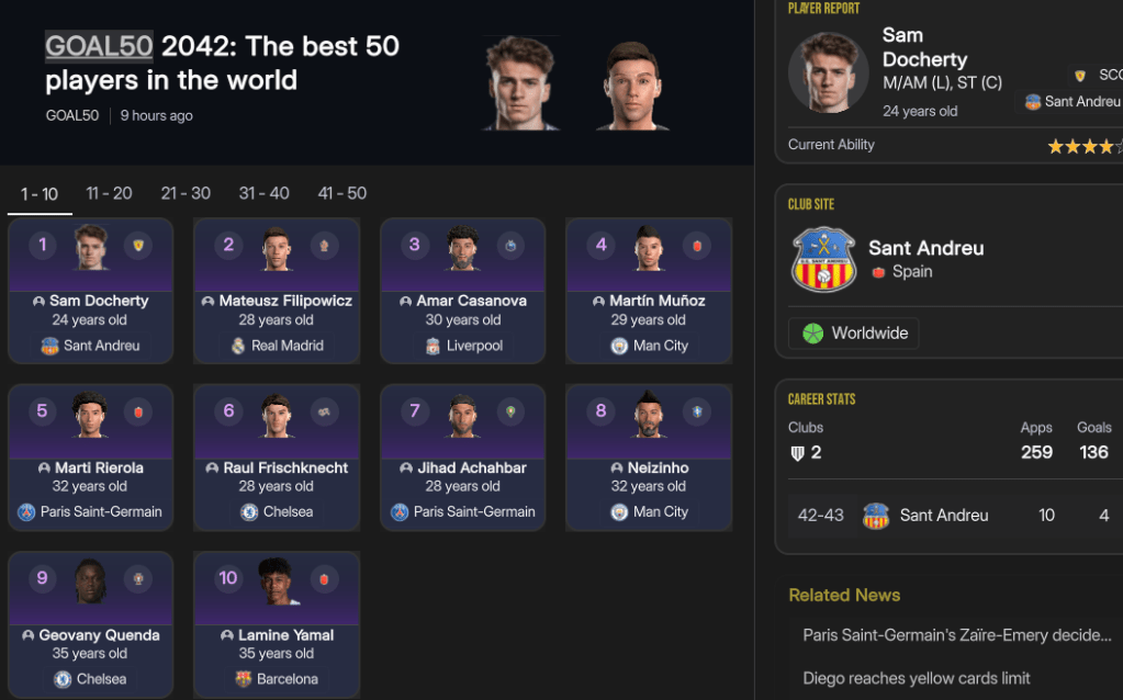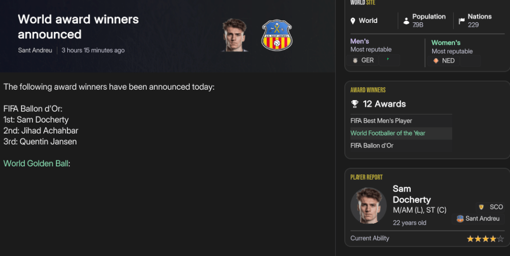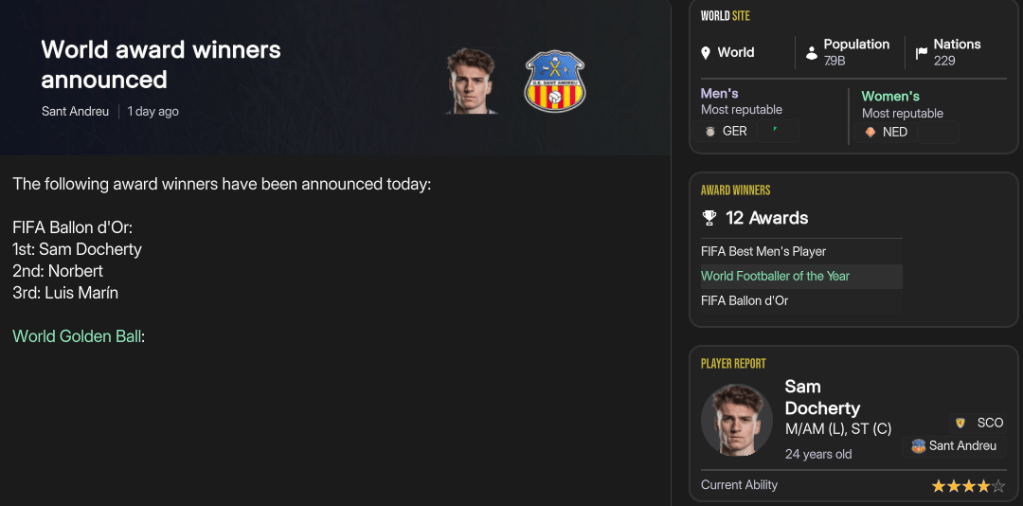 Sant Andreu’s stars continued to be honoured as Docherty, aged 21, became the club’s first Ballon d’Or winner at the end of 2040, with Jansen in 3rd, and won the FIFA Best U21 Men’s Player ahead of Jansen and Bonacic. Docherty backed that up with another Ballon d’Or in 2041 and finally made it into Goal50, but only in 40th. The striker went to the next level as he won both the FIFA Best Men’s Player and FIFA FIFPro Player of the Year in December. Centre back Marco Liotta became the latest player to win European Golden Boy, before Nikolaidis came 3rd in NxGn 2042, with fellow academy graduate left back Rivaldo Sequeira 10th, striker Achille Agoro 19th, Leonardi 30th (aged 16), Dahl 31st, midfielder Madani Keita 38th and attacker Asey Tewelde 47th. Sant Andreu officially conquered the world in 2042, as Docherty won Ballon d’Or for the third year in a row, with Norbert and Marín 2nd and 3rd, then won Goal50 in November, with Marín 50th, before Marín won FIFA Best Men’s Player and FIFA FIFPro Player of the Year.