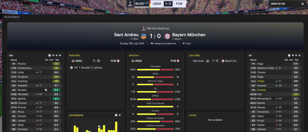 Recent success saw Sant Andreu head to their first Club World Cup in Germany a month later. They started well with Docherty’s hat trick leading a 7-1 hammering of Toronto, before beating Egypt’s Al-Ahly 5-2 and Saudi’s Al-Ahli 2-0. Docherty’s header was enough to see off Leipzig 1-0, Marín and Docherty downed Marseille 2-0 in the quarters and they completely dominated PSG in the semis, having 21 shots to 7, and Jansen’s brace led a 4-0 win. That sent them into the Final against Bayern in their own stadium. The hosts edged a poor first half, but the Spaniards hit the front as Bonacic’s strike took a huge deflection. They completely bossed the game with 64% possession, and that goal was all Sant Andreu needed to become Champions of the World!