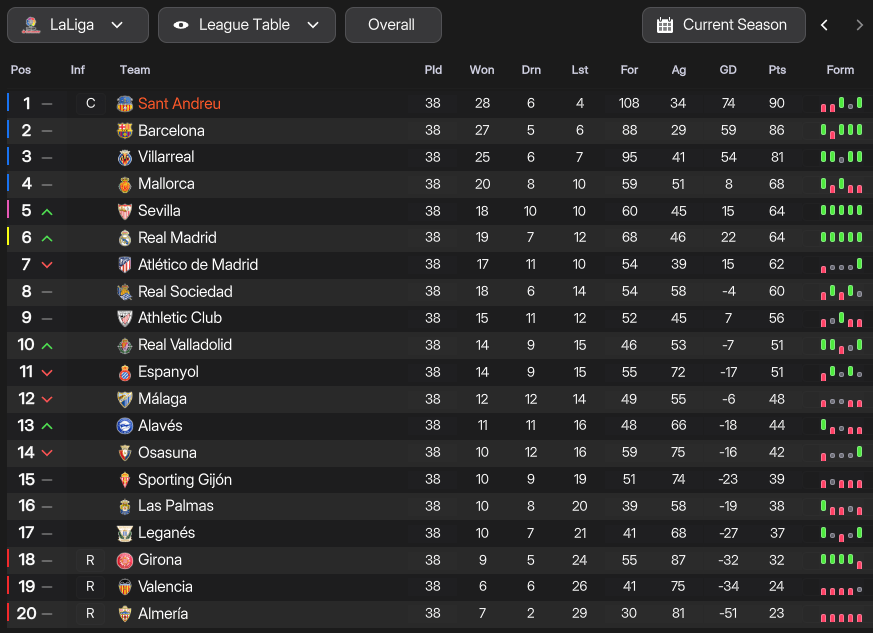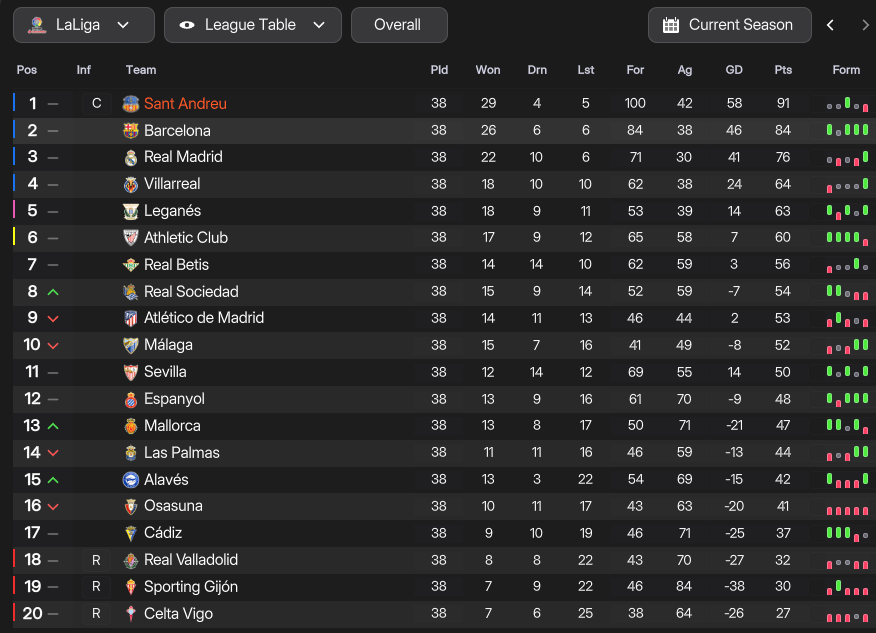 Sant Andreu began the 2042/43 campaign with testimonials for Marín, Iglesias and goalkeeper Roy Álvarez. They began the season well, but not as well as an in-form Villarreal. However, a return to form for Docherty, who struggled with injuries early on but scored 13 in 5 games in March, saw them move 6 points clear. A 3-2 win at Real virtually secured another title, and they wrapped up four in a row with two games remaining, with Marín scoring the winner on his 500th league appearance for his home club. They went on to win the league by 7 points, finishing on 91 points after 28 wins, 7 draws and 3 defeats, scoring 96 and conceding 35. Jansen was the league’s best player with a 7.64 rating, ahead of Docherty and Marín (7.35 and 7.32), Docherty was the top scorer with 25 in 31 and Iglesias led the assists chart with 15.