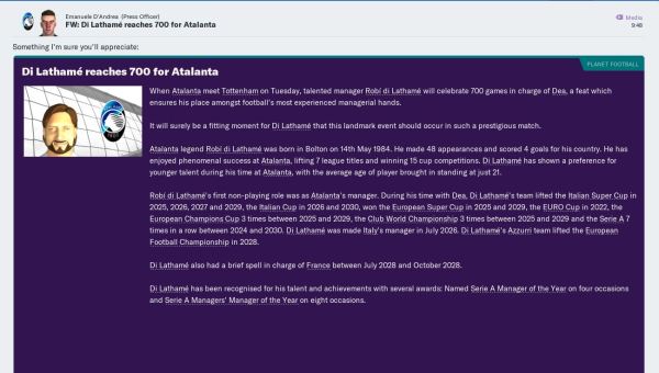 Last time I joked about becoming the greatest manager of all time at Atalanta. Well, we've made some progress towards that aim with Robi di Lathamé becoming the greatest English manager of all time
