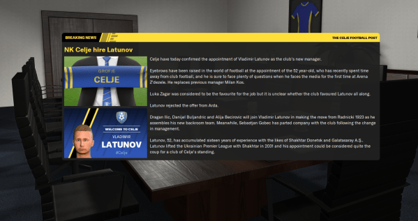 Russian manager Vladimir Latunov had overseen an impressive turn in fortunes for his new club NK Celje. The Slovenian side finished just outside the relegation zone in the 2035/36 campaign, but sat top of the league unbeaten mid-way through the current season.