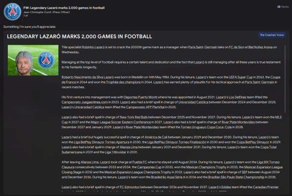 Having moved into his 80s, Robinho Lazaró was as passionate about football as ever. And one thing that maintained that passion was seeing young players excel at the highest level. His young Paris Saint-Germain side delivered exactly that as they repaid his faith by lifting the French cup in 2063.